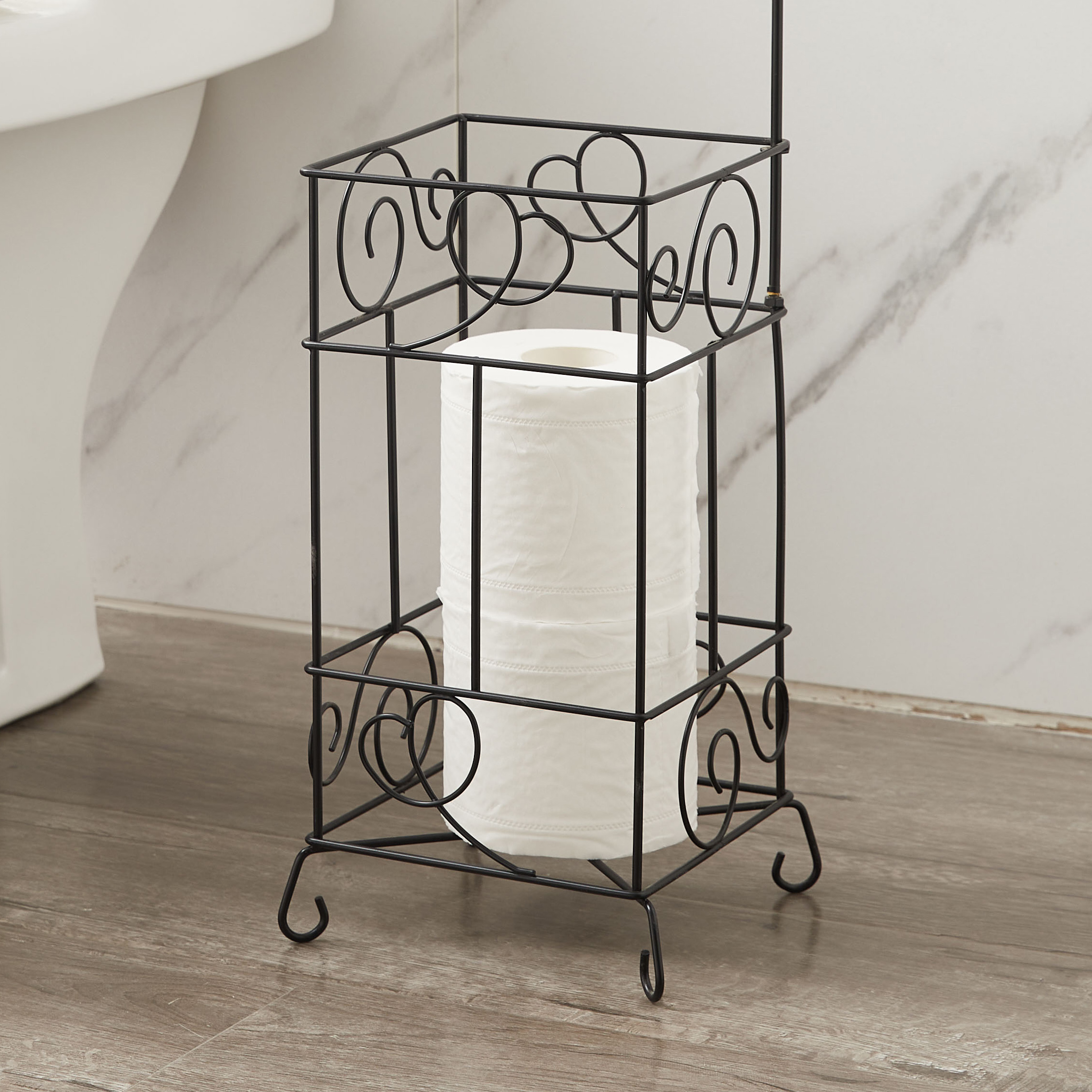 | Keep your extra toilet paper rolls organized and within reach with this toilet paper holder stand. Add a toilet paper holder to your bathroom without drilling or damaging your walls. Sturdy metal frame is water resistant, features intricate metal design and stands high above the floor to minimize moisture retention. Dress up your bathroom with this toilet paper holder stand.
