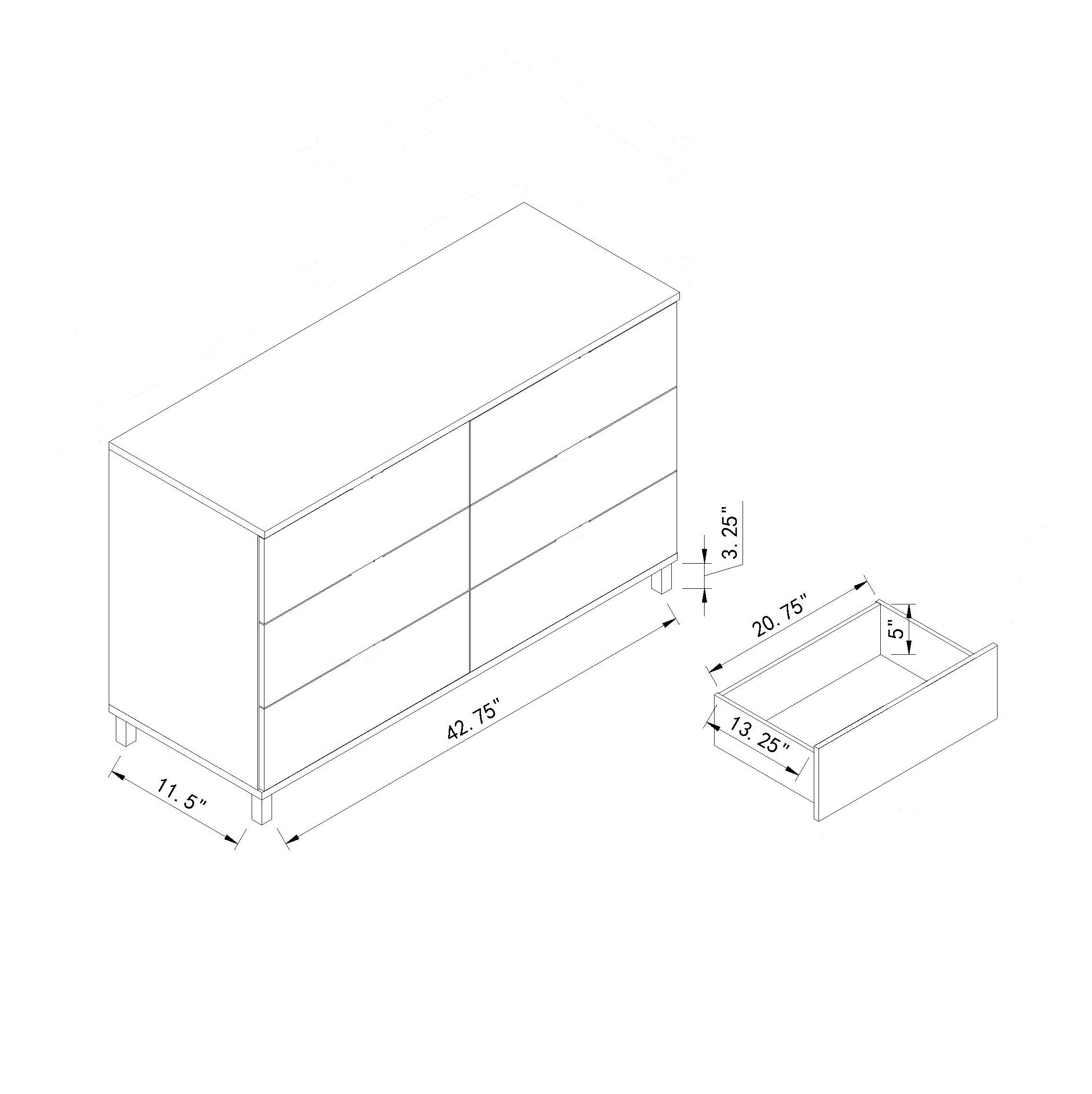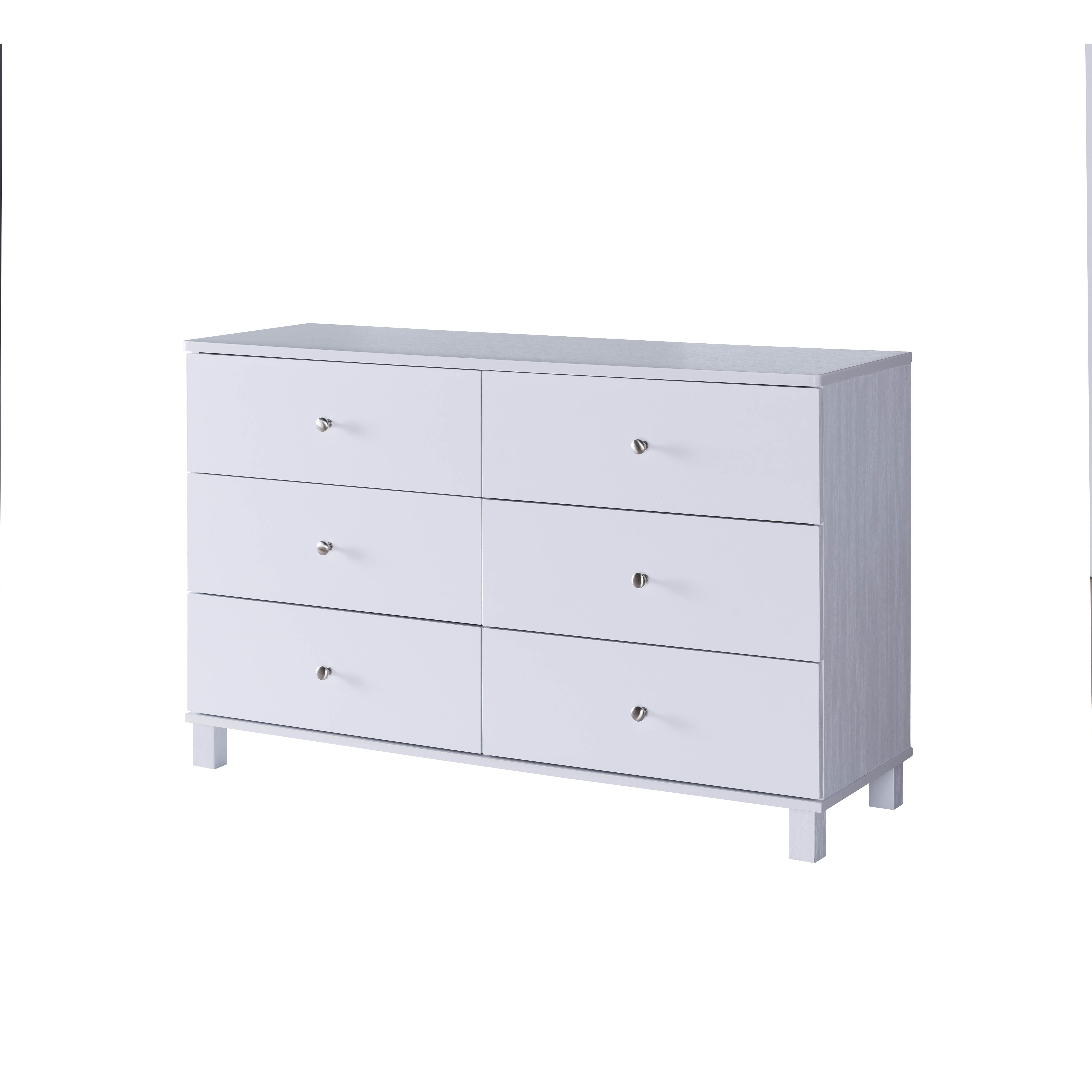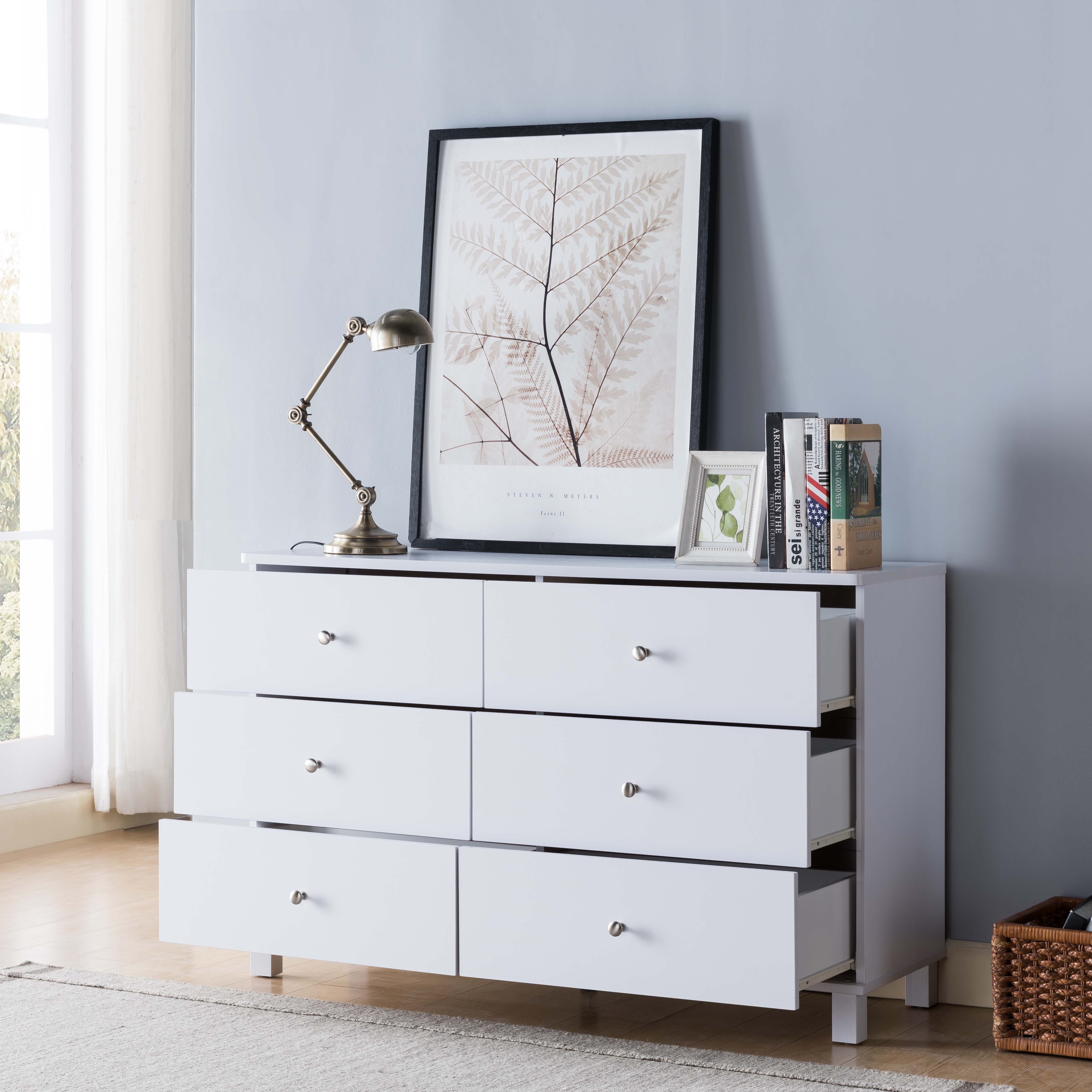 | This dresser provides plenty of storage via six drawers on metal glides. Each drawer is accented by an elegant metal knob handle. Matching set pieces available.